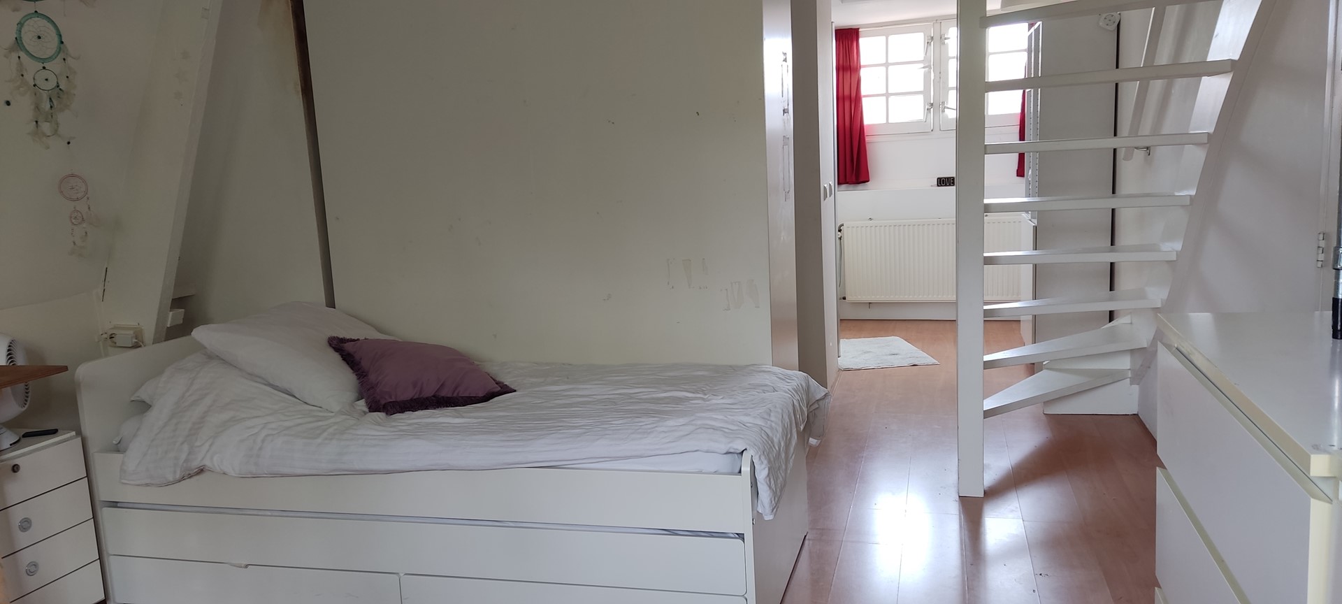 Via the stairs to the 3rd floor, hall with toilet and access to the kitchen and living room. The kitchen is also equipped with a washing machine, hob, extractor hood and refrigerator. The living room is light and spacious with light from both sides. There is room for a separate dining area. Via the stairs to the 4th floor with a bedroom and a fitted wardrobe. The loft with another sleeping area can be accessed via a staircase in the bedroom. Furthermore, a bathroom with shower and sink.