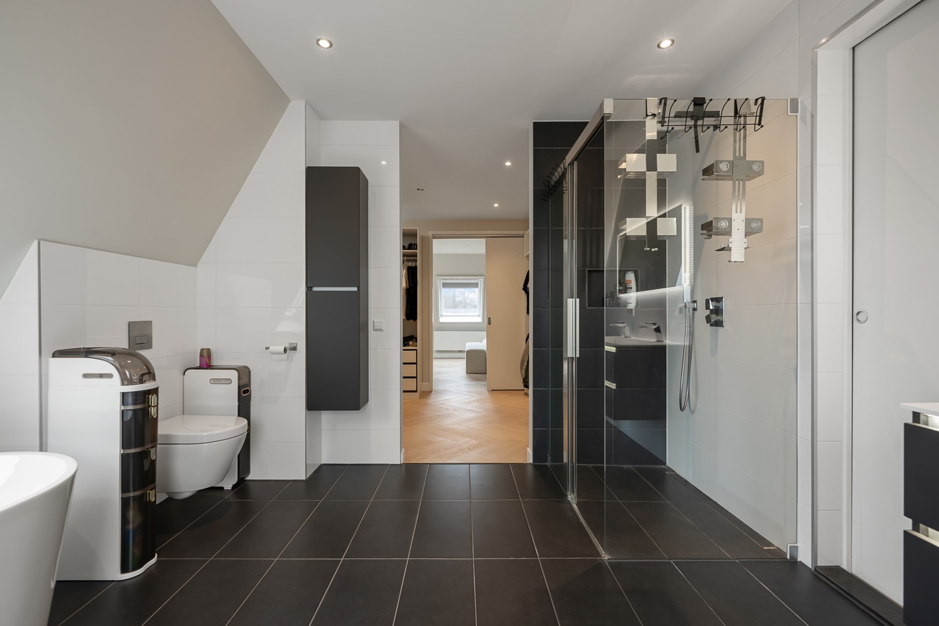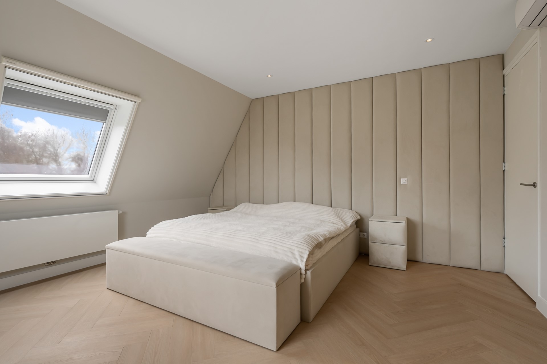 Op de tweede verdieping vinden we naast de 2 andere slaapkamers nog de master bedroom die een ware privésuite is, compleet met een ruime inloopkast en aansluitend de luxe badkamer met ligbad, douche, toilet en wastafel. Hier geniet u van rust, comfort en privacy.