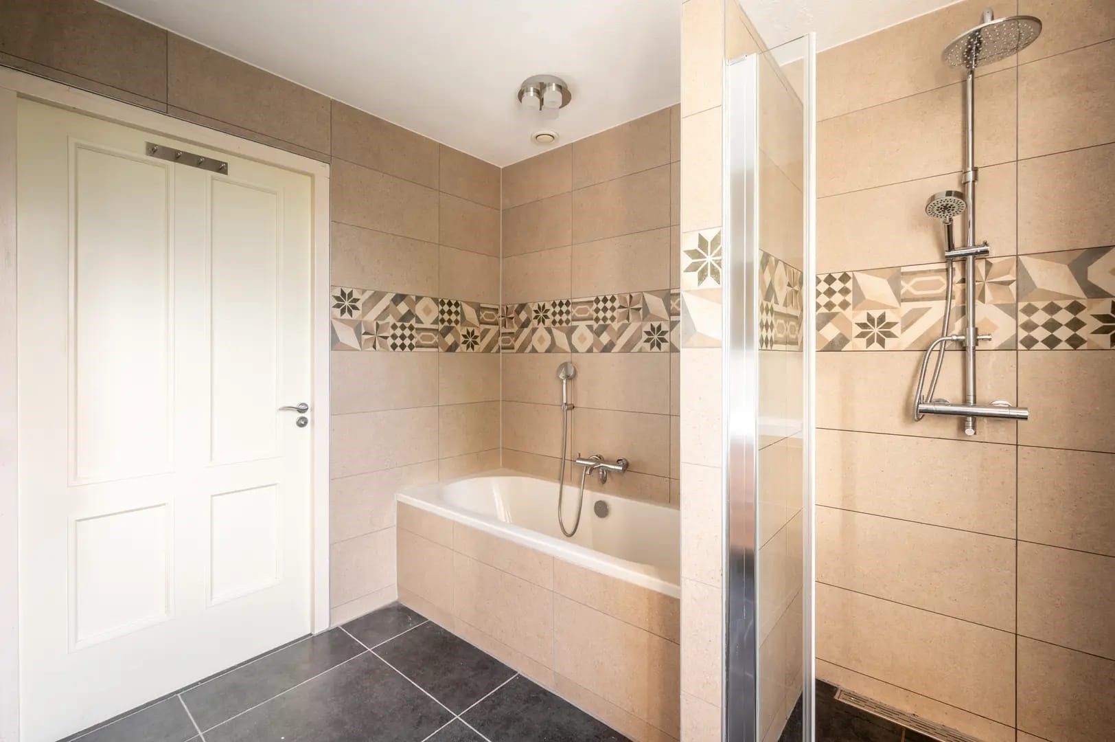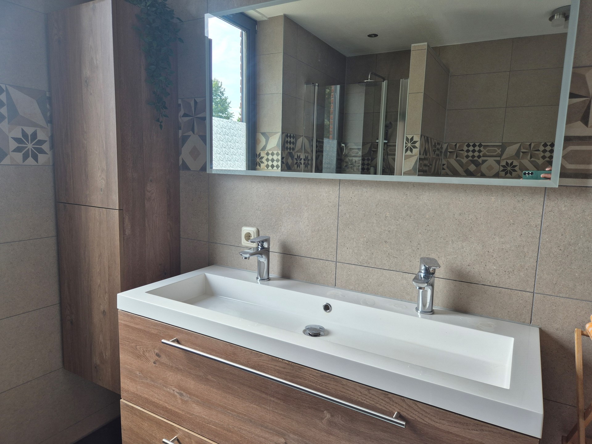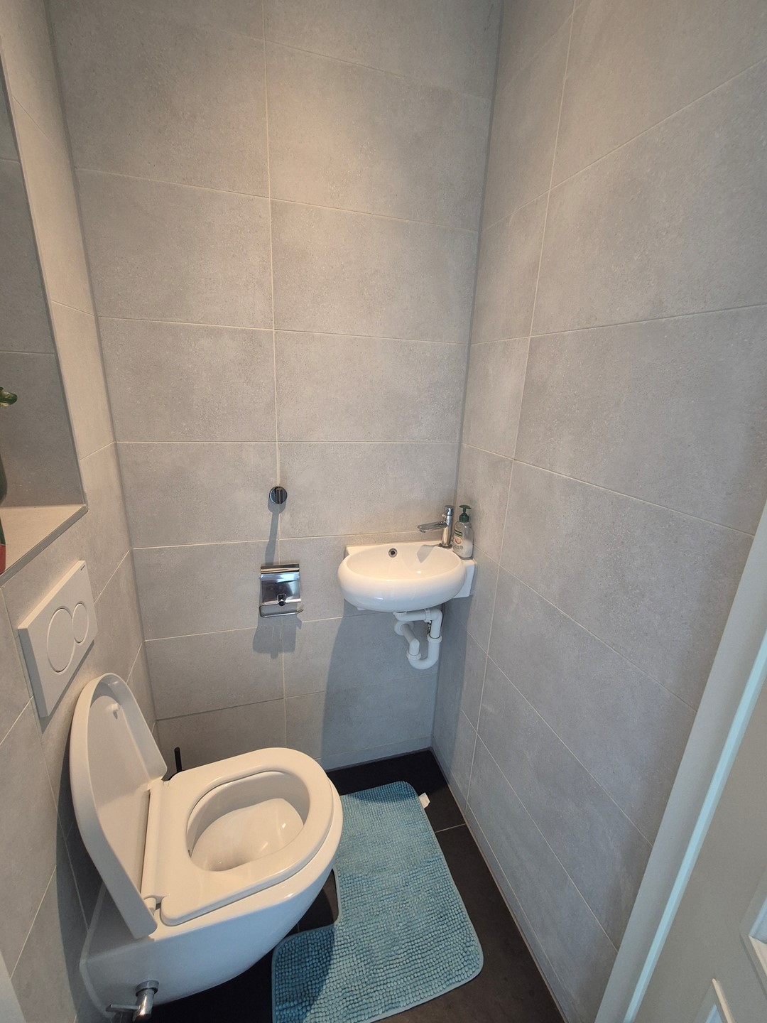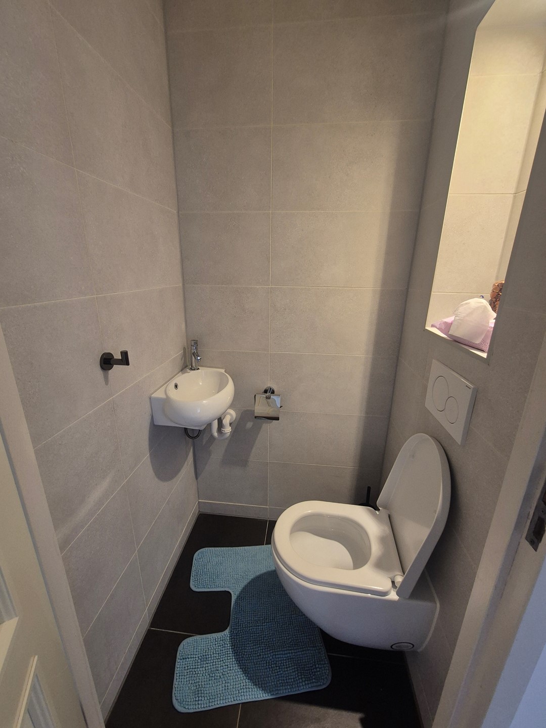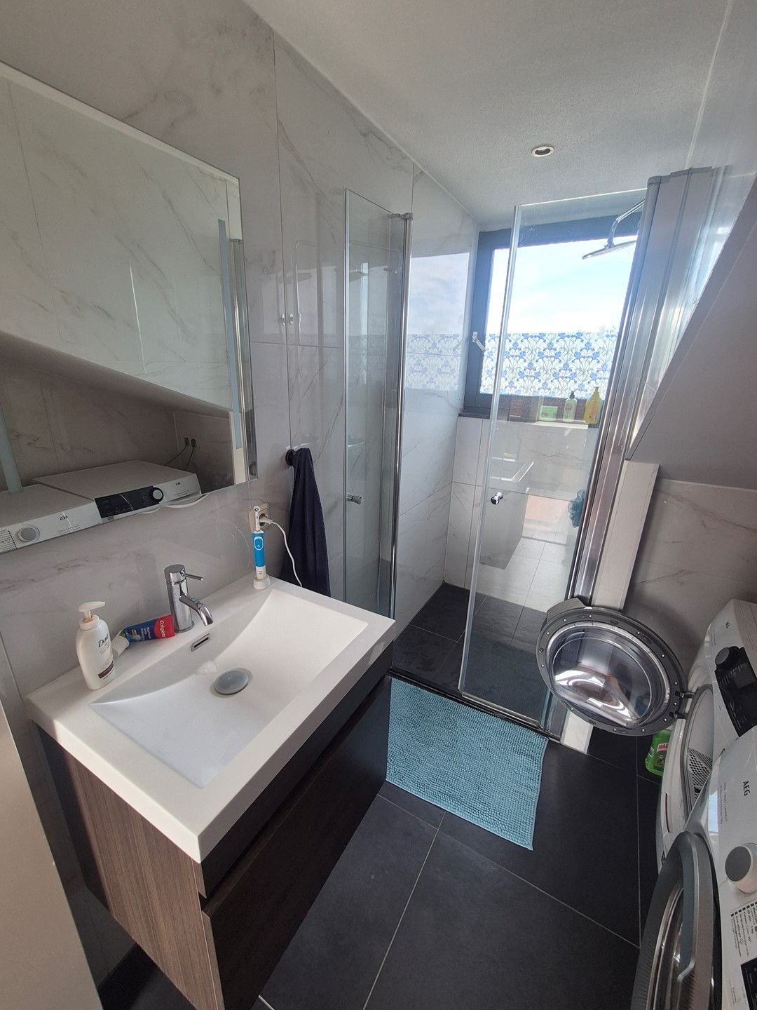 Overloop met separate toiletruimte en toegang tot 2 slaapkamers. De badkamer is uitgevoerd met lichte betegeling tot het plafond, douche, ligbad, wastafel en een raam voor extra ventilatie. De gehele verdieping is voorzien van een nette laminaatvloer. Via de open trap op de overloop bereikt u de 2e verdieping.