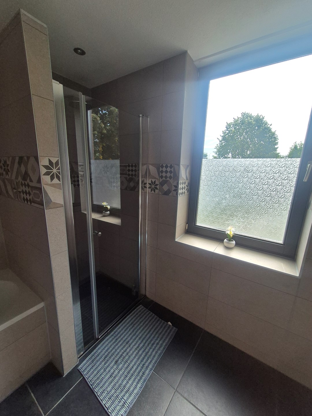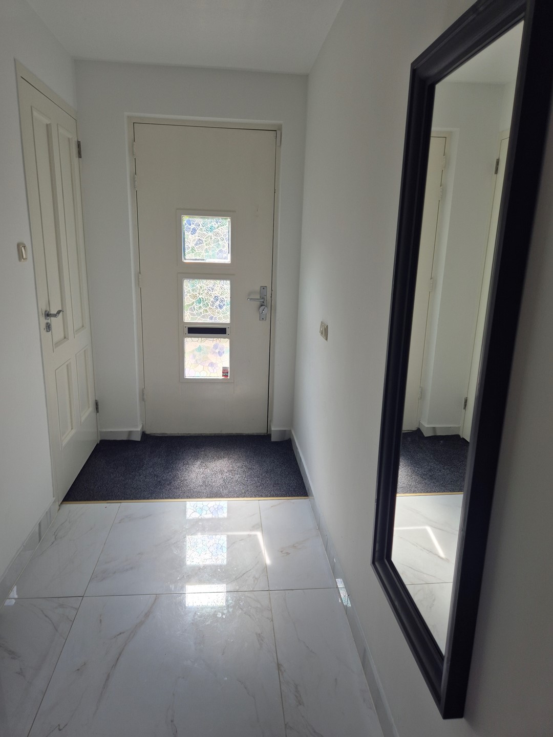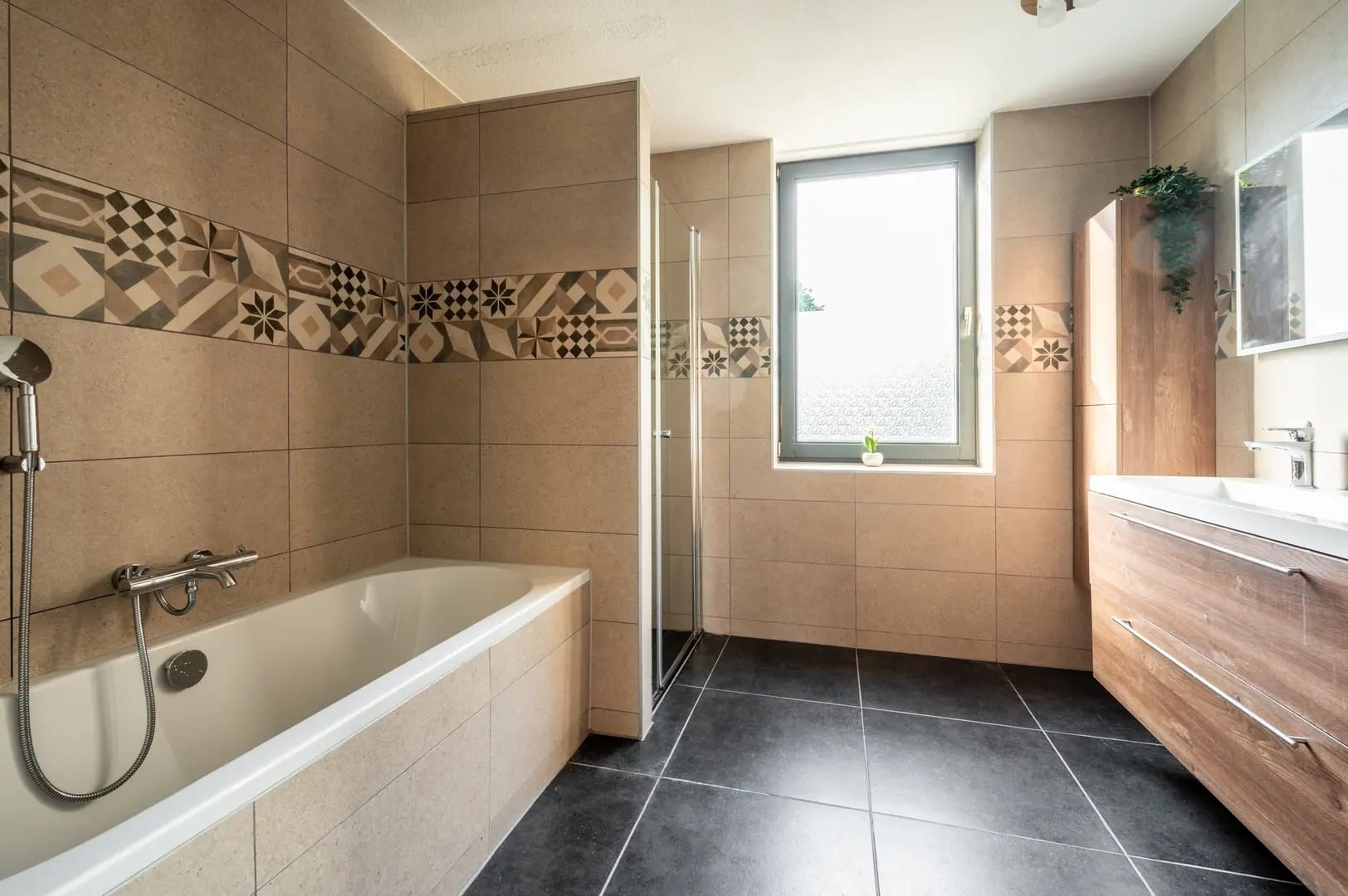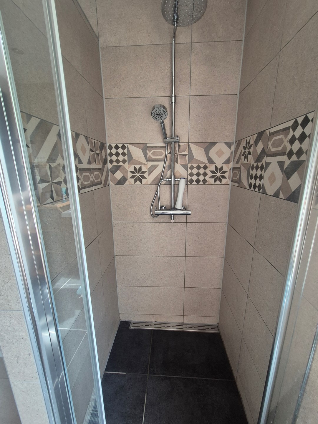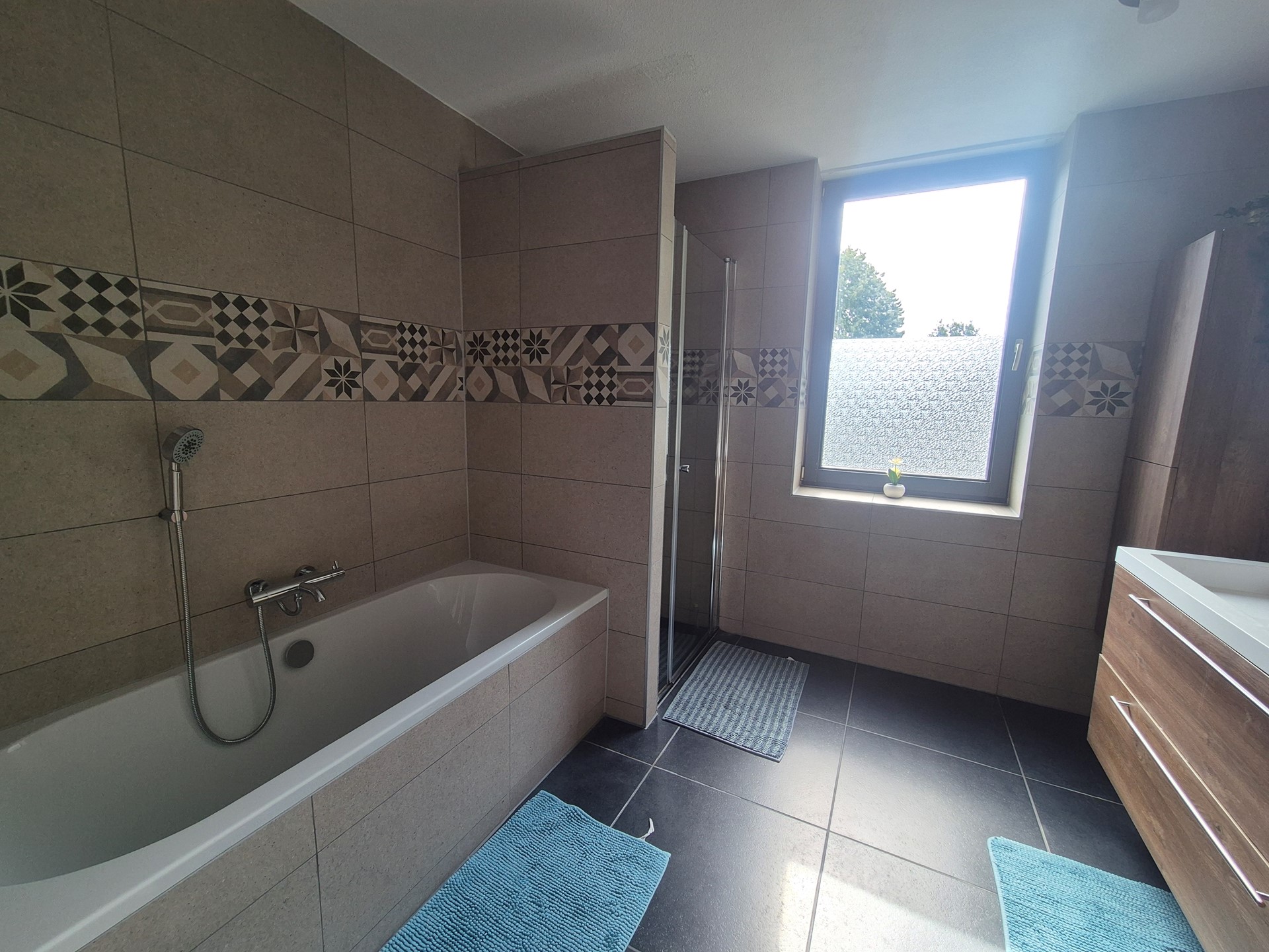 Overloop met separate toiletruimte en toegang tot 2 slaapkamers. De badkamer is uitgevoerd met lichte betegeling tot het plafond, douche, ligbad, wastafel en een raam voor extra ventilatie. De gehele verdieping is voorzien van een nette laminaatvloer. Via de open trap op de overloop bereikt u de 2e verdieping.