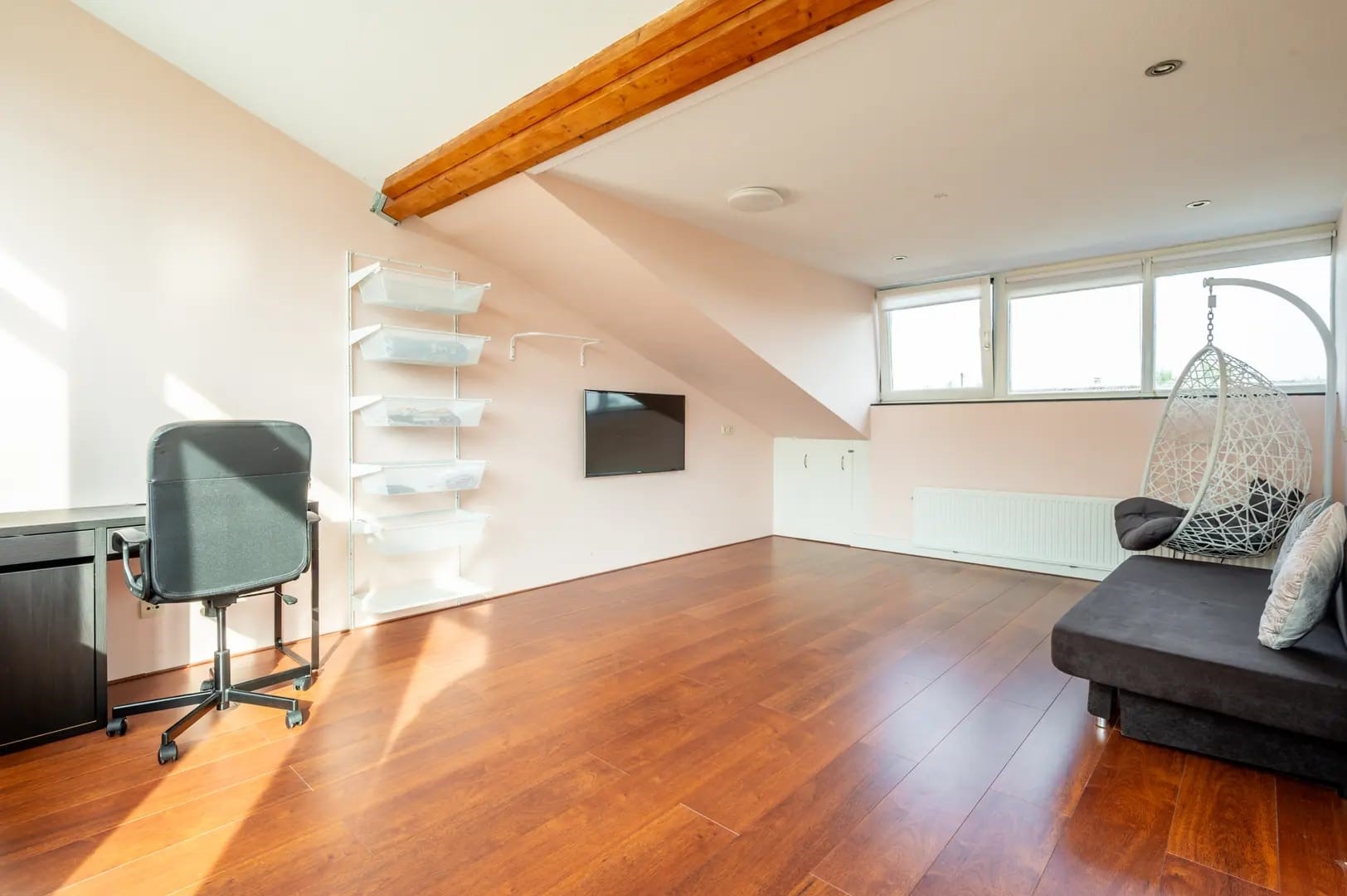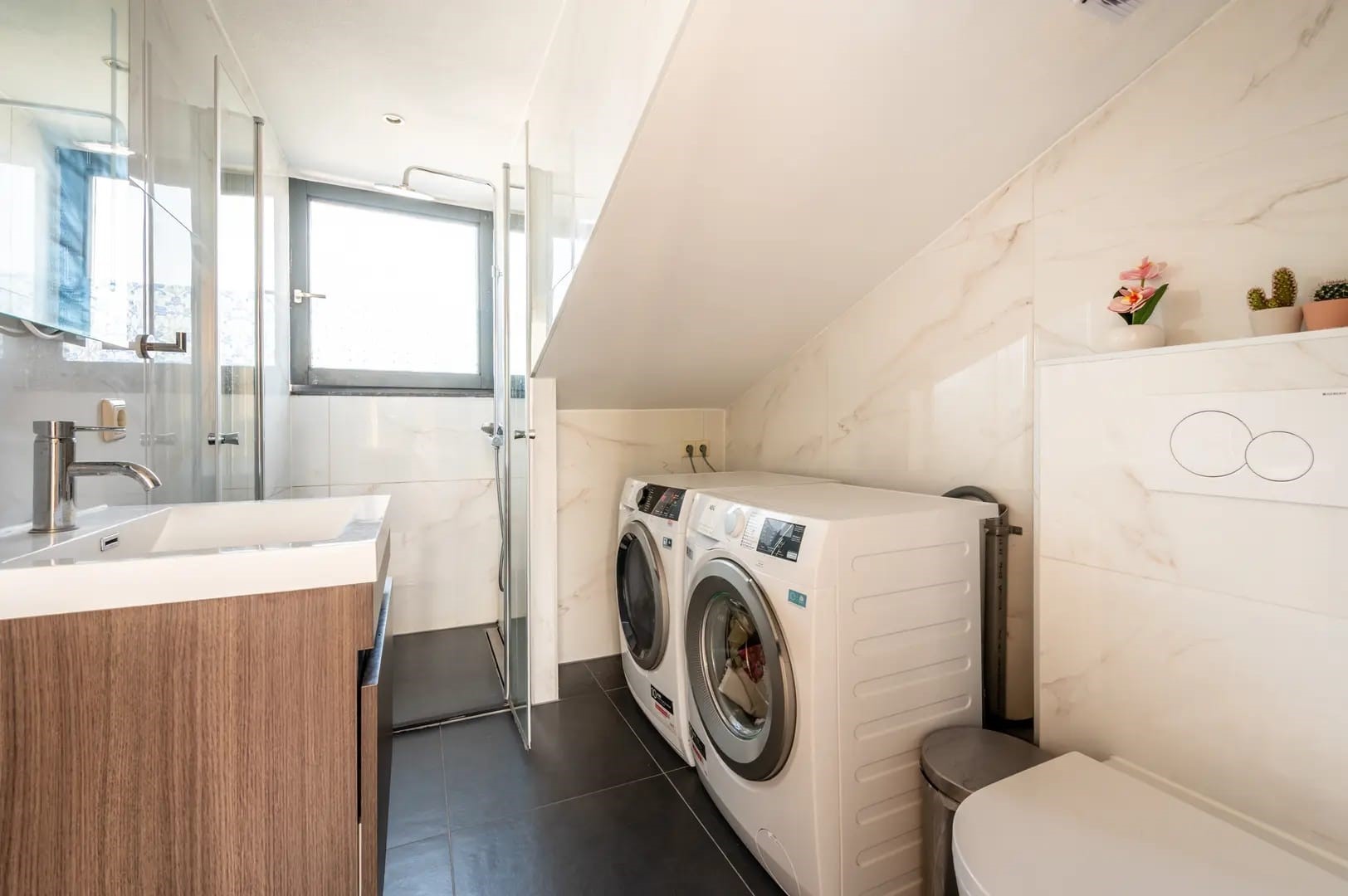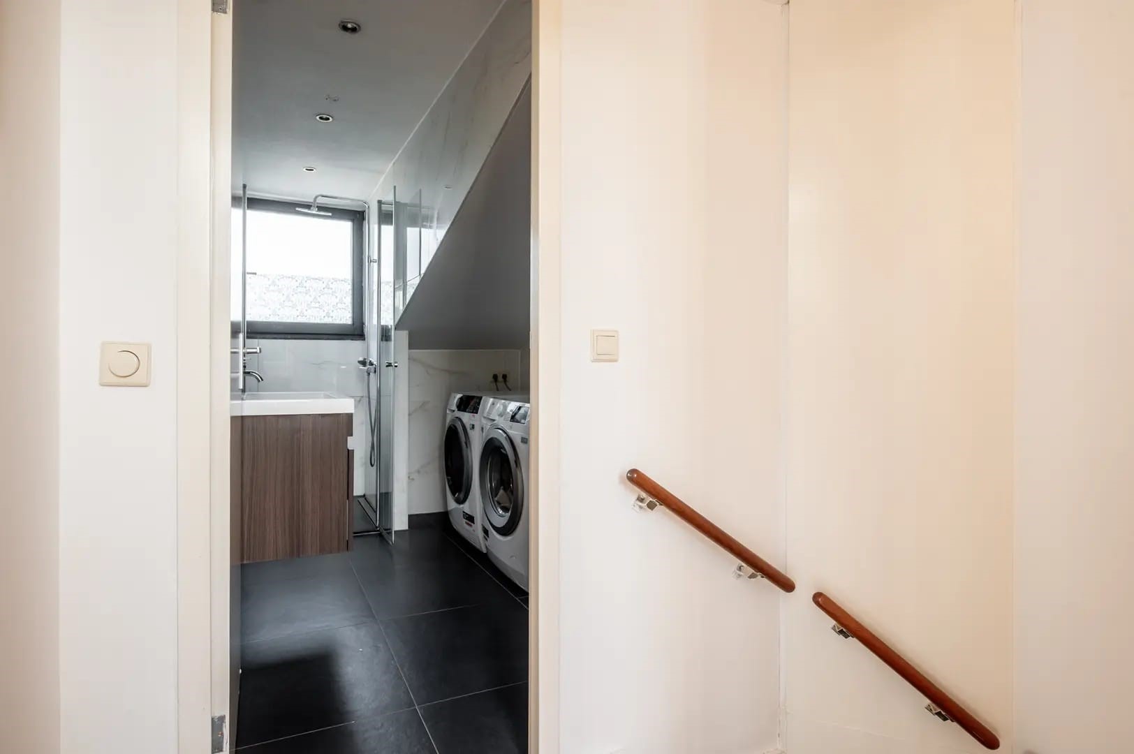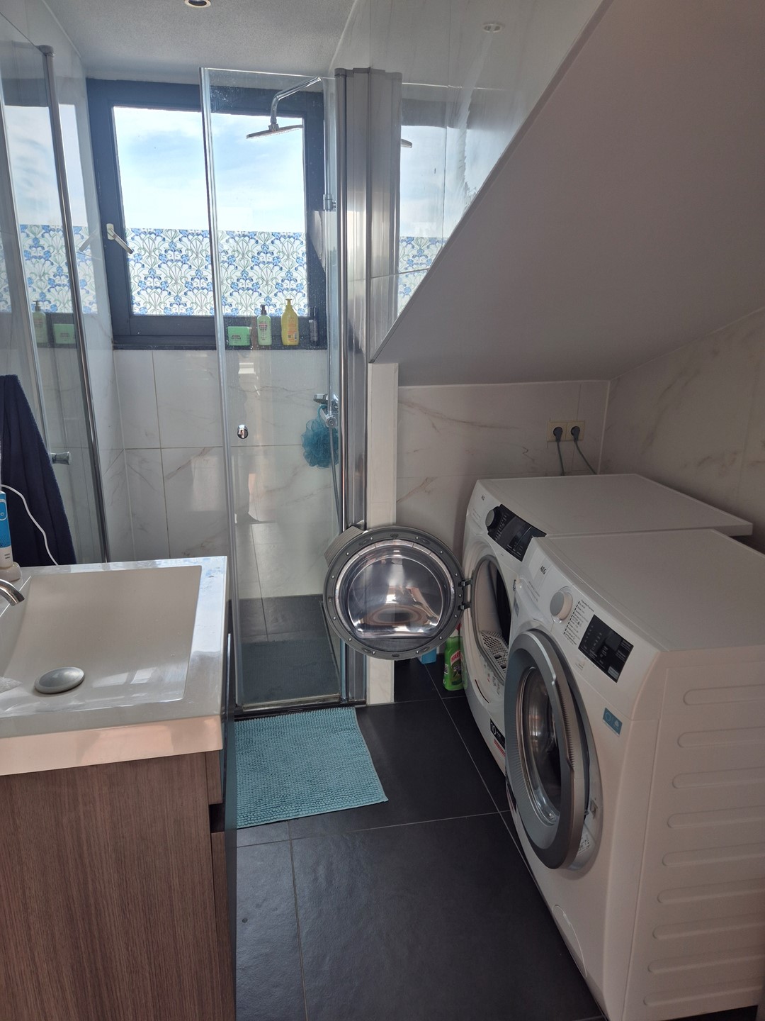 Voorzolder met aansluiting voor wasmachine- en droger en toegang tot de 4e ruime zolderkamer met dakterras. Het dakterras (11 m2) is gelegen op het zuidoosten en heeft vrij uitzicht aan de voorzijde. Ook op deze verdieping is er een badkamer met douche en toilet dus handig als u gasten heeft. Ook hier is de verdiepingsvloer voorzien van een nette laminaatvloer en ook de wasmachine en droger aansluiting.
